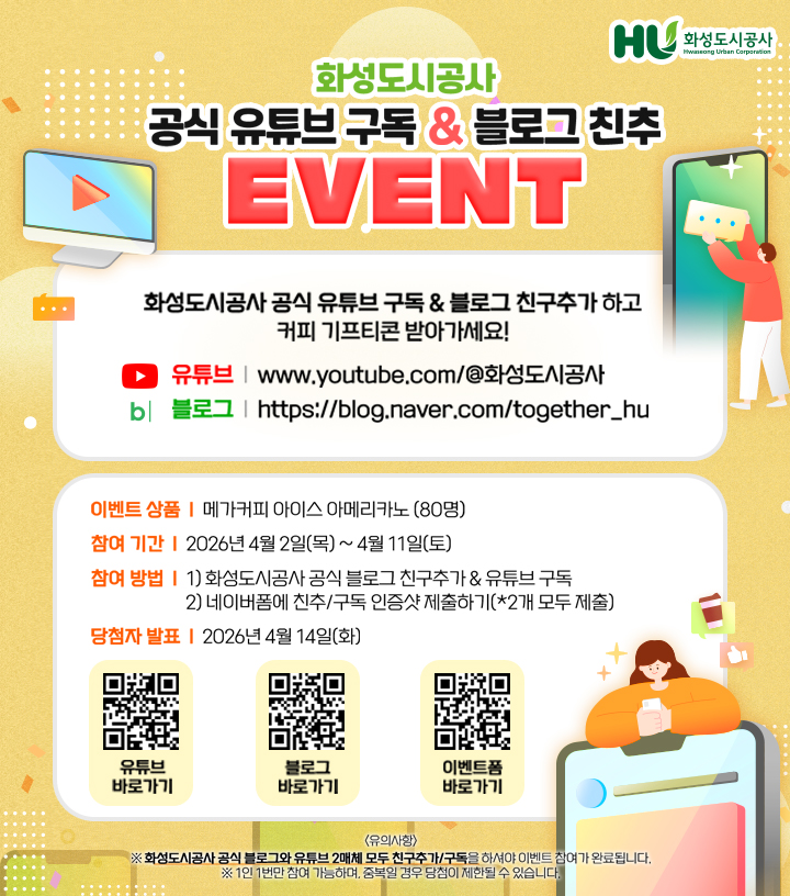 | 화성도시공사 공식 유튜브 구독 & 블로그 친추 이벤트 안내 | ||